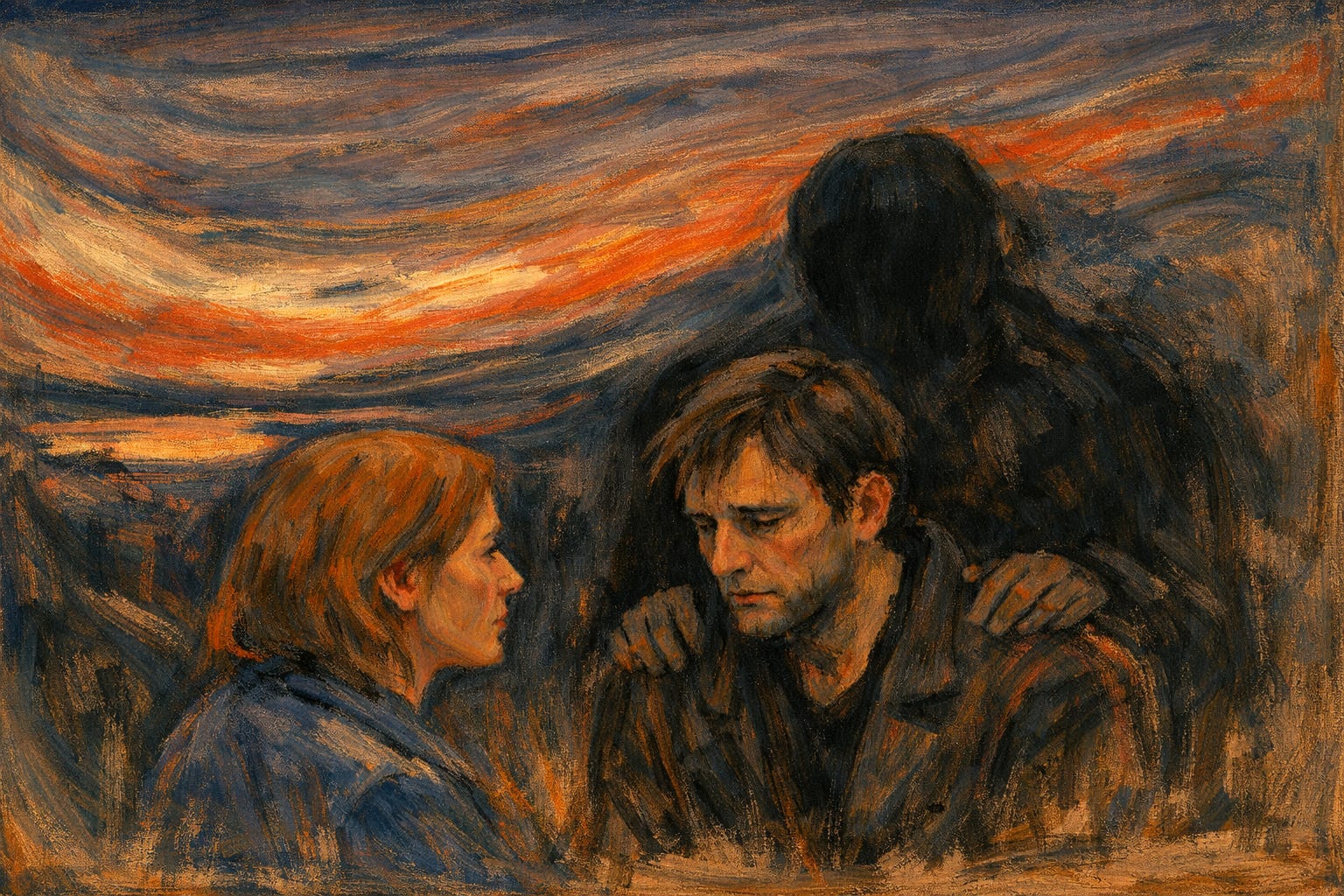I keep seeing a scene in my head: two people facing each other. One asks the question. The other stands with something behind them, just out of frame, like a dark shape with hands and shoulders pressed close to their back.